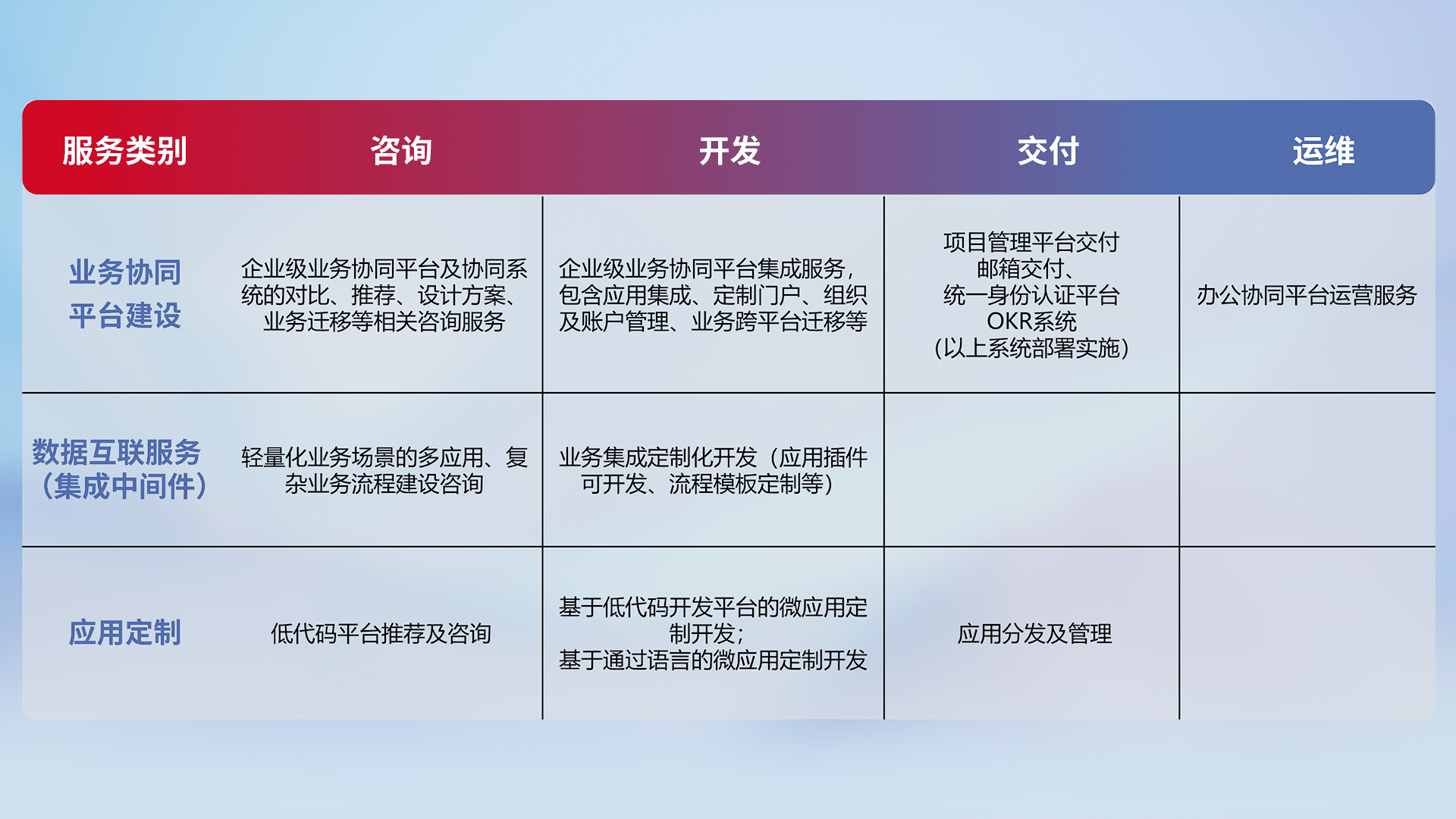 针对钉钉、、、企微、、IDaas等平台级产品提供产品的规划、、方案、、、、交付、、、定制化开发等服务,,,,实现如统一协同办公、、智能客户服务、、混合会议管理、、、智能数据查询、、、等业务场景,,,实现数字化转型。。。