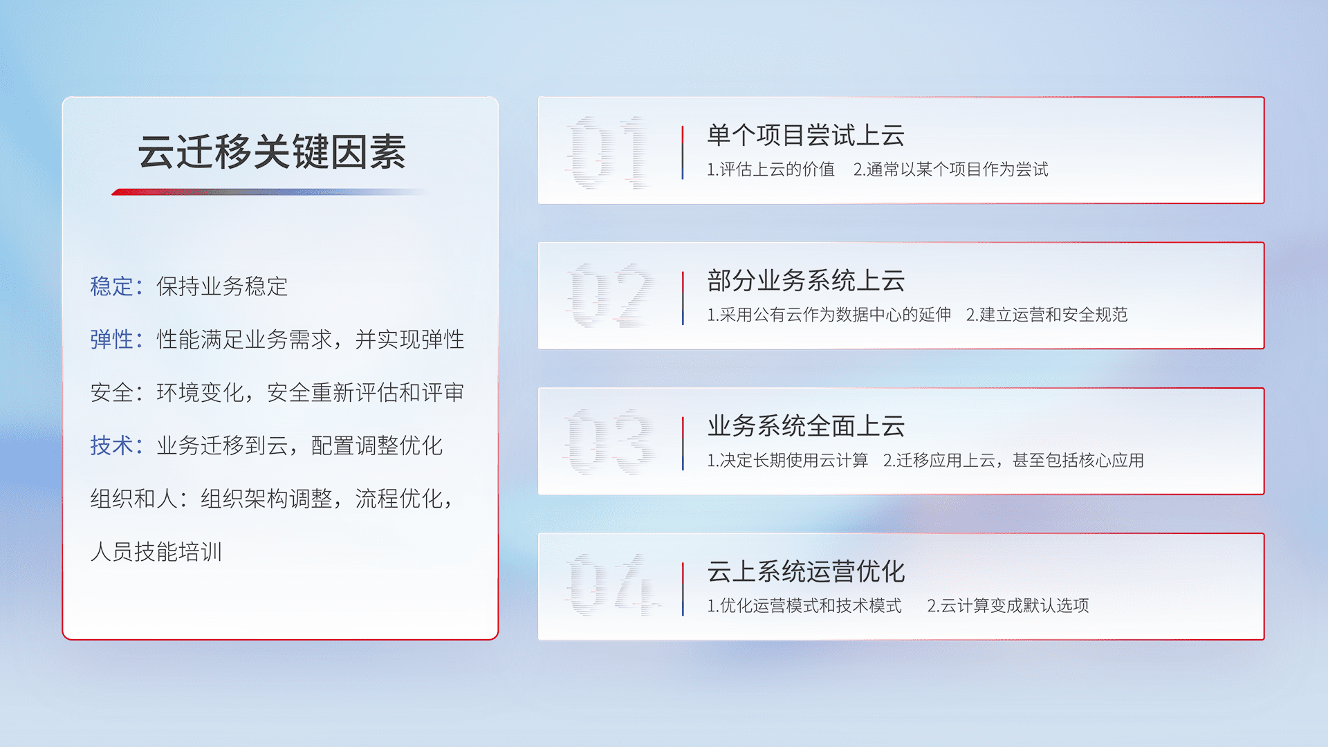 结合实际业务,,,从规划设计、、云平台选型、、、、云原生改造、、、数据迁移、、、、集成交付,,,,迁移全过程为客户识别最佳上云路径,,做好风险识别管理,,,设计网络架构、、、、身份权限、、、、安全审计合规、、、、操作审计、、、日志审计、、监控告警策略、、、、多站点容灾设计等,,对云上基础设施进行整体规划,,,提升IT治理水平,,,,以满足弹性、、高可用、、高性能的需求。。。