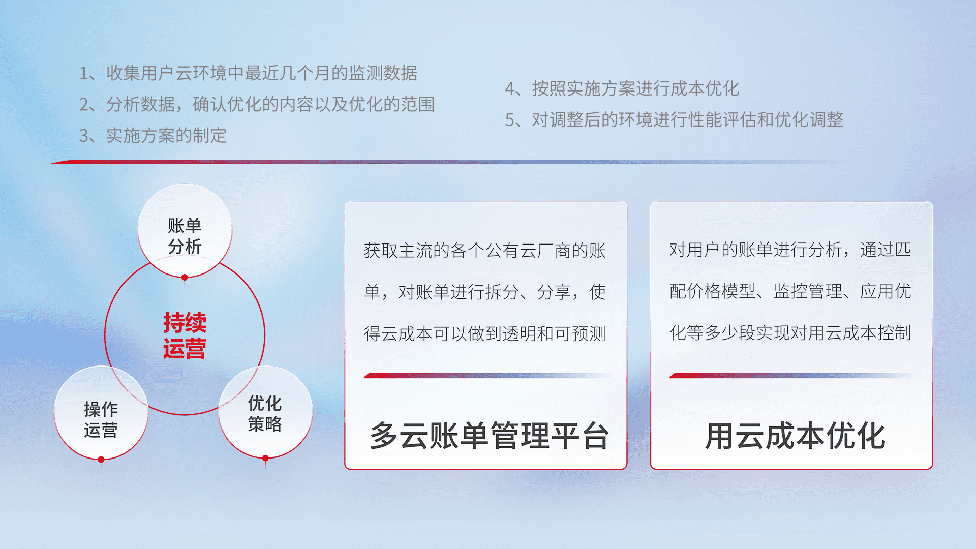 通过多云纳管,,,以统一的资源数据模型把客户的云资源进行抽象和封装,,进而实现对多云资源的统一操作,,保障云资源管理的可靠性、、、稳定性与可用性。。。。量身定制化运维内容,,,配置、、、开发运维、、、、补丁管理、、、、备份、、、监控、、、认证和访问管理、、审计和日常巡检等,,保障在用云过程中的可靠度,,,,稳定度以及高可用率。。。。