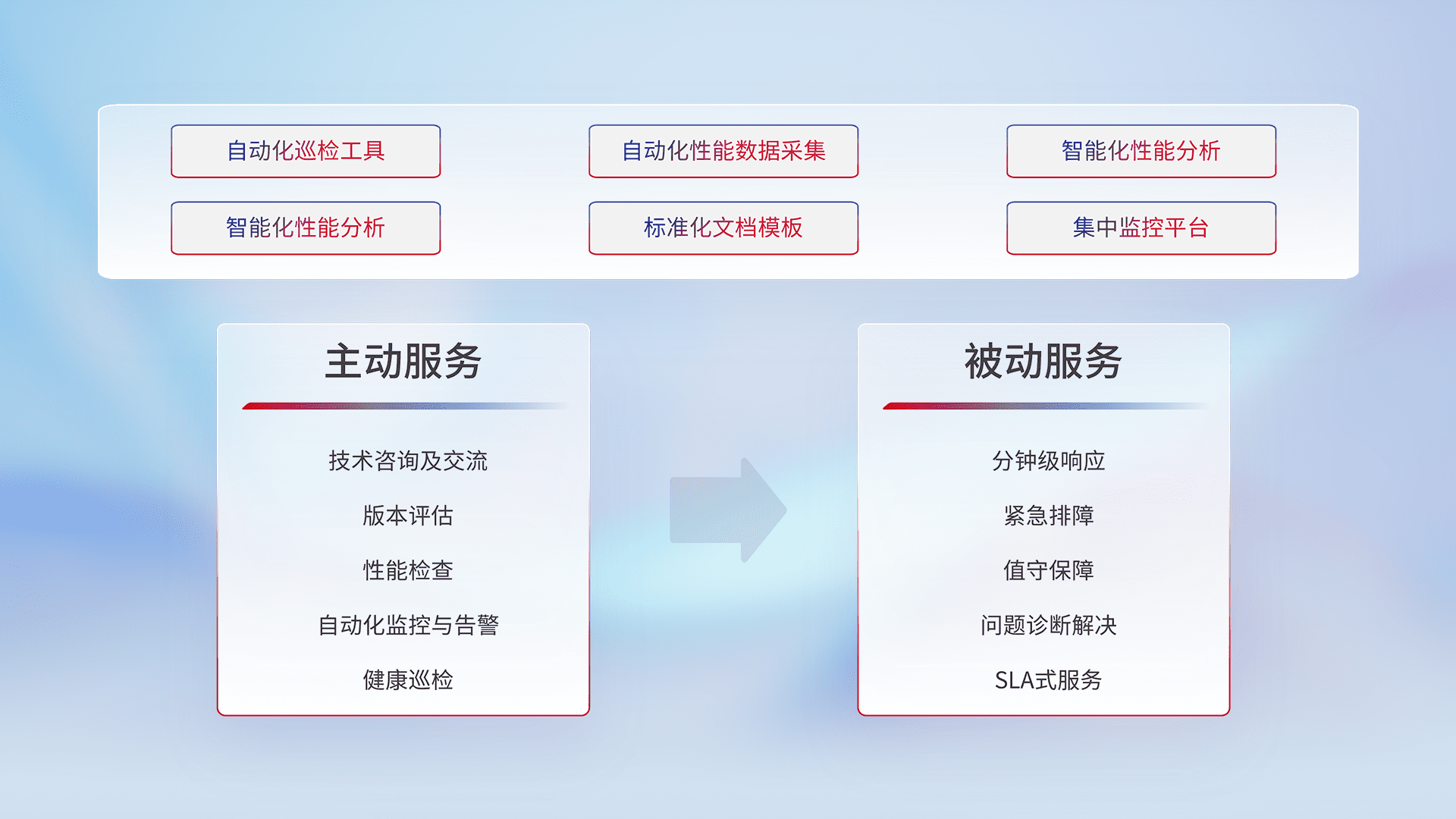 智能化工具和标准化文档,,,保障服务质量,,,提供主动服务(包含技术咨询、、、、版本评估、、性能检查、、、、自动化监控与告警、、健康巡检)和被动服务包含(分钟级响应、、、、紧急排障、、、、值守保障、、、问题诊断解决、、、SLA服务)。。。。